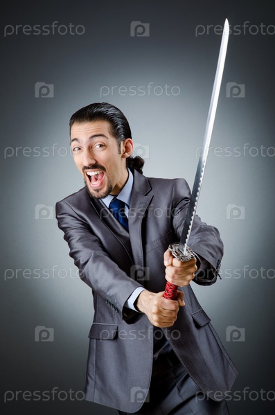 Сердитый бизнесмен с мечом в темной комнате