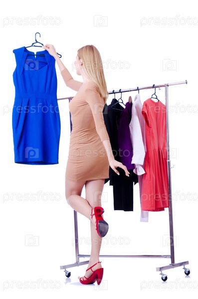Женщина примеряет новую одежду на белом фоне