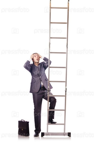 Бизнесмен поднимается по лестнице, изолированный на белом фоне