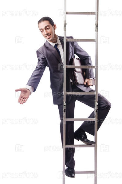 Бизнесмен поднимается по лестнице, изолированный на белом фоне