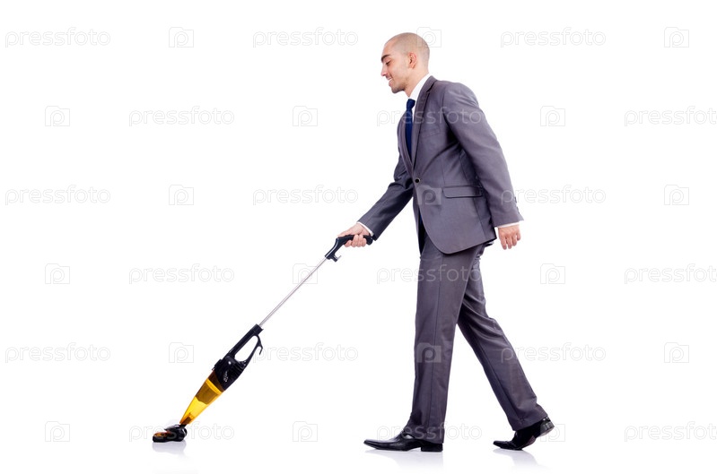 Бизнесмен с пылесосом на белом фоне