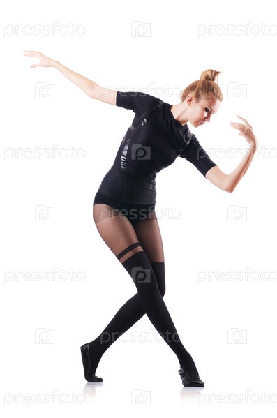 Молодая женщина танцует на белом фоне