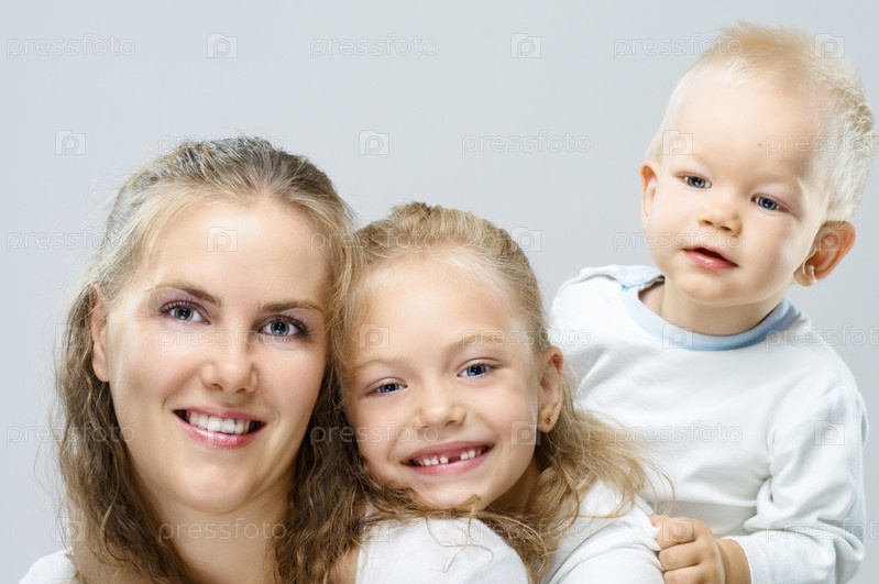 Счастливые мать и дети на сером фоне