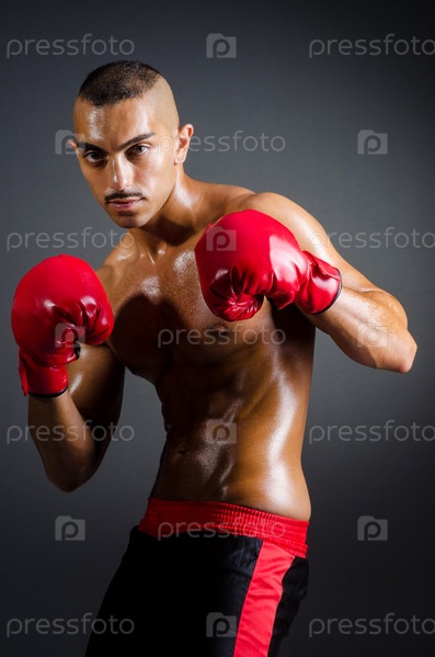 Боксер с красными перчатками в темной комнате