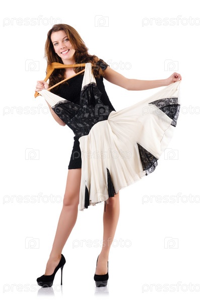 Женщина примеряет новую одежду на белом фоне