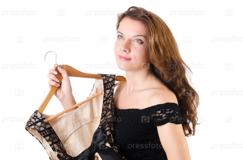 Женщина примеряет новую одежду на белом фоне