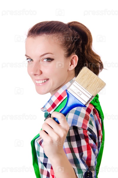 Женщина-маляр с кистью на белом фоне