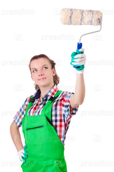 Женщина-маляр с кистью на белом фоне