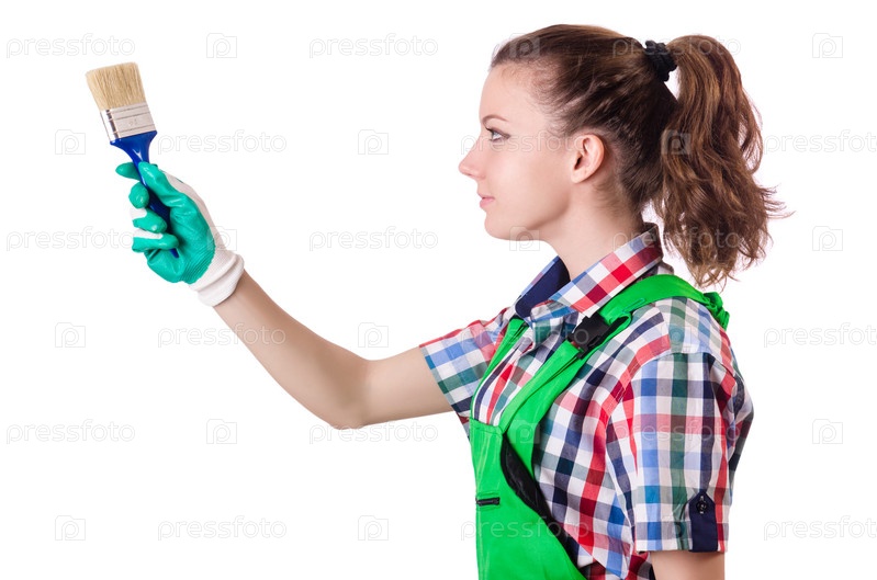 Женщина-маляр с кистью на белом фоне