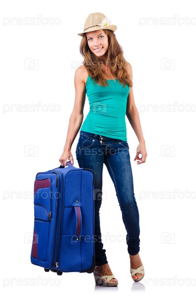 Девушка с чемоданом на белом фоне