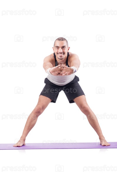 Мужчина делает упражнения на белом фоне
