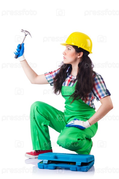 Женщина строитель, изолированная на белом
