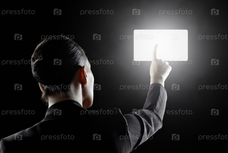 Рука деловой женщины на белой кнопке на черном фоне