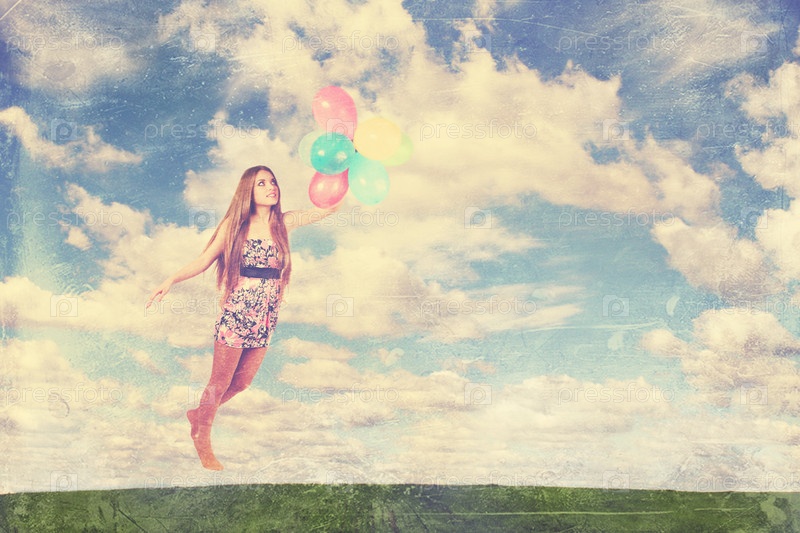 Женщина летит на воздушных шарах