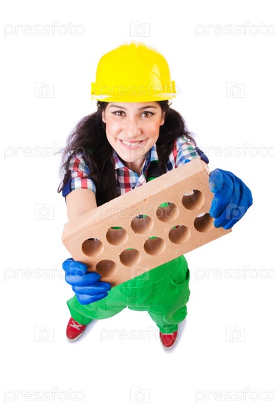 Женщина-строитель с кирпичами на белом фоне
