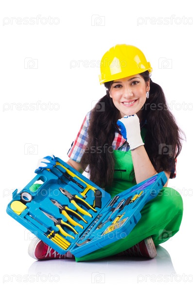 Женщина-строитель на белом фоне