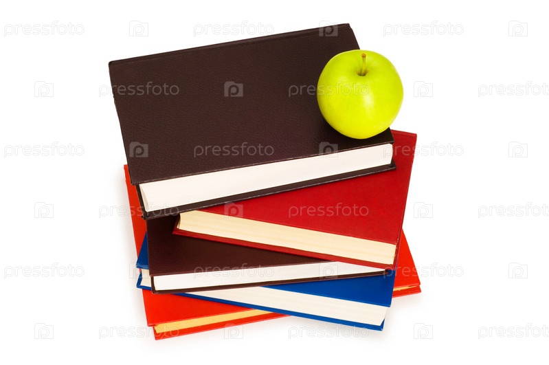 Стопка учебников и яблоко на белом фоне
