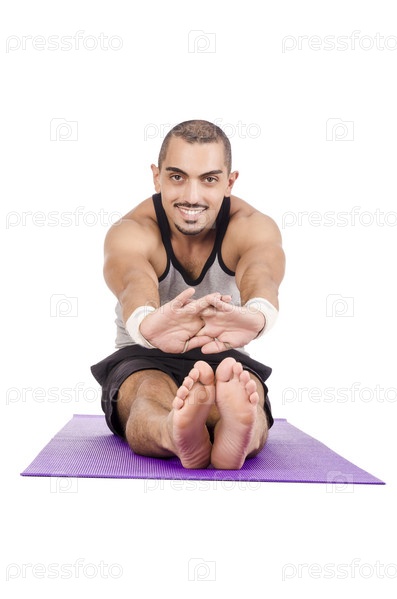 Мужчина делает упражнения на белом фоне