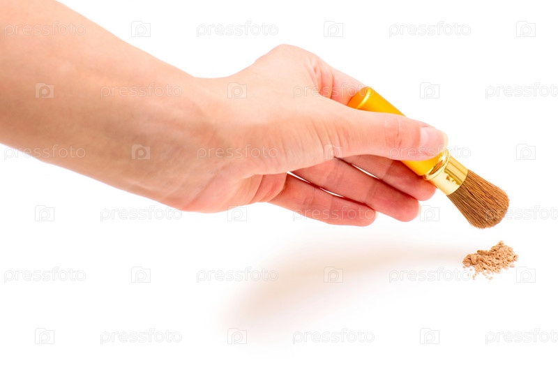 Женская рука с макияжной кисточкой, изолированная на белом фоне