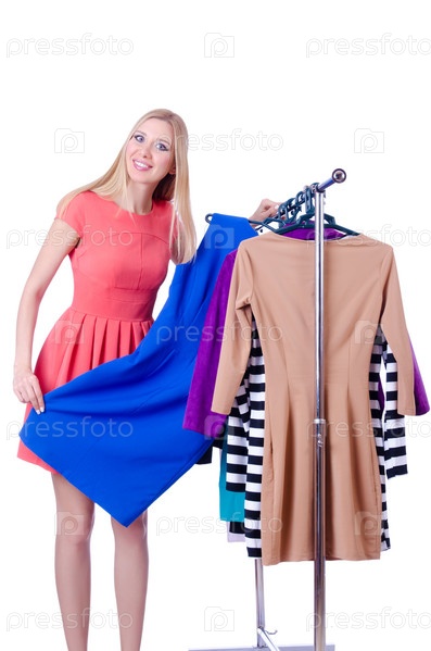 Женщина меряет новую одежду на белом фоне