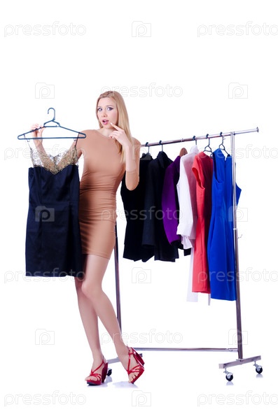 Женщина меряет новую одежду на белом фоне