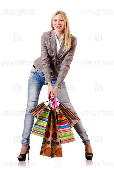 Привлекательная женщина после рождественских покупок на белом фоне