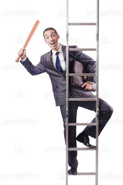 Бизнесмен поднимается по лестнице, изолированный на белом