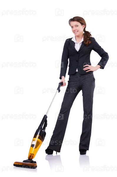Молодая женщина пылесосит