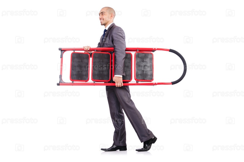 Бизнесмен с лестницей, изолированный на белом