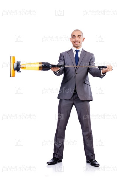 Бизнесмен с пылесосом на белом фоне