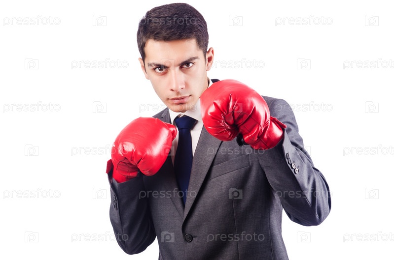 Бизнесмен с боксерскими перчатками на белом фоне
