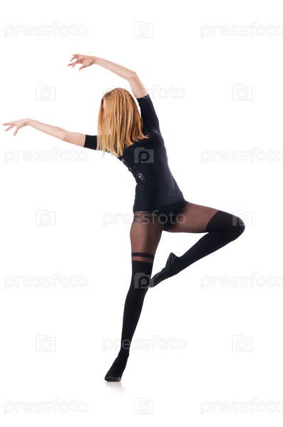 Молодая женщина танцует на белом фоне