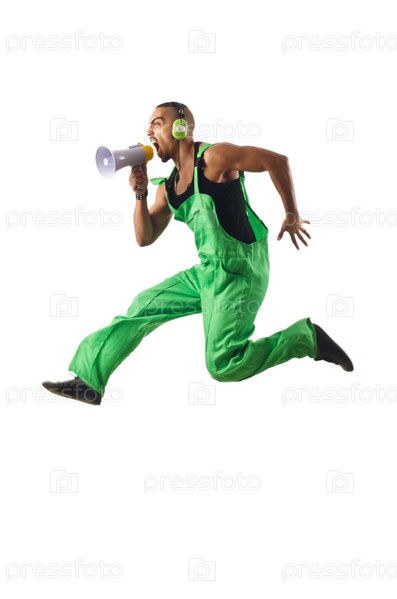 Строительный рабочий прыгает и танцует