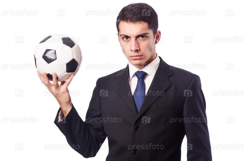 Молодой предприниматель с футбольным мячом на белом фоне