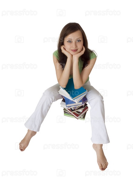 Девушка со стопкой учебников на белом фоне