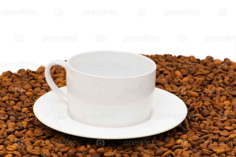 Белая чашка среди кофейных зерен