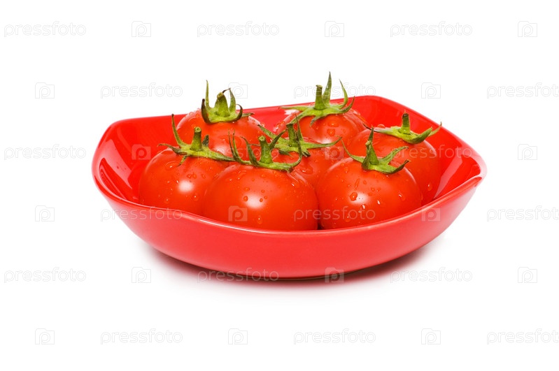 Помидоры на красной тарелке, на белом фоне