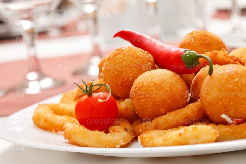 Жареные луковые кольца и сырные шарики