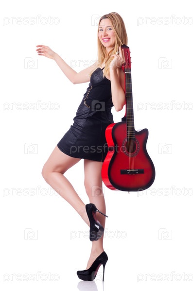 Женщина играет на гитаре, изолированная на белом