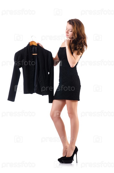 Женщина меряет новую одежду на белом фоне
