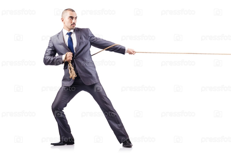 Мужчина тянет веревку на белом фоне