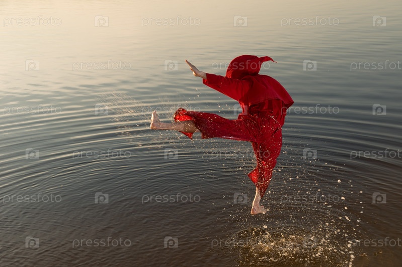 Монах в красном колпаке занимается каратэ