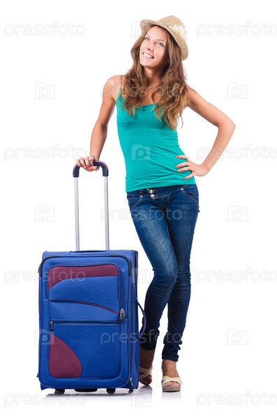 Девушка с чемоданом на белом фоне