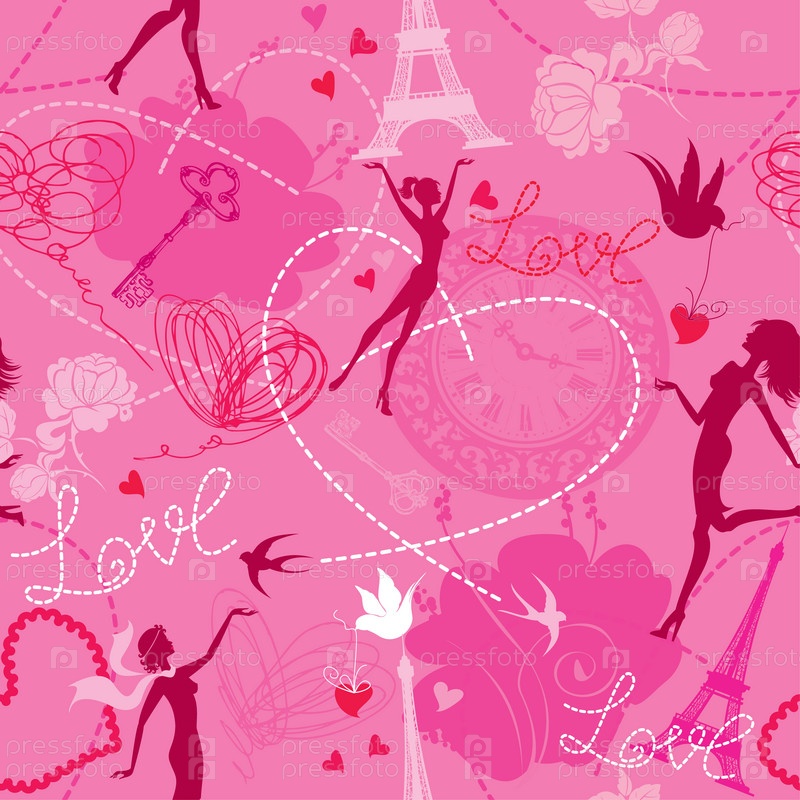 Бесшовный розовый шаблон с силуэтами модных девушек, сердец и птиц. Мечты о любви в Париже