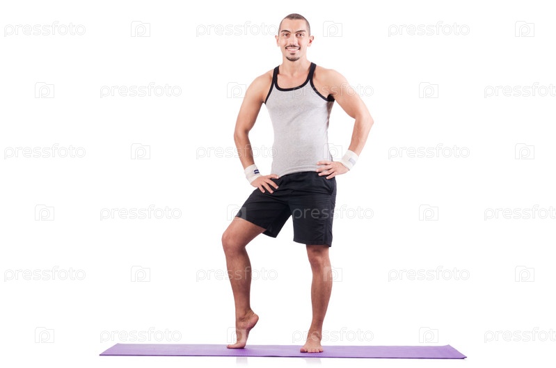 Мужчина делает упражнения на белом фоне