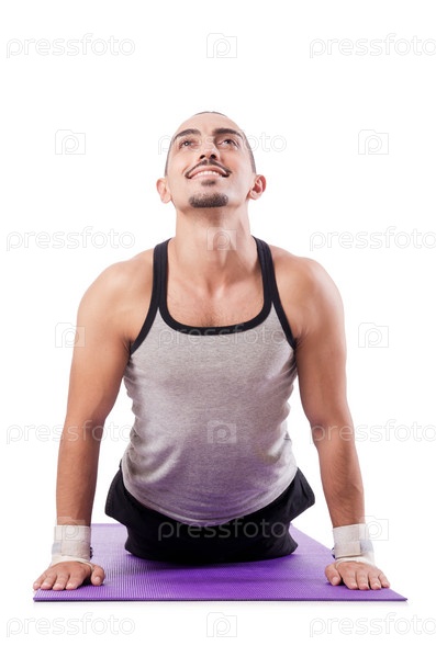 Мужчина делает упражнения на белом фоне