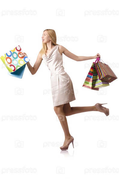 Высокая девушка после удачного шопинга на белом фоне