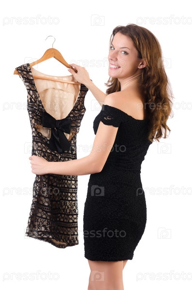 Молодая женщина примеряет новую одежду на белом фоне