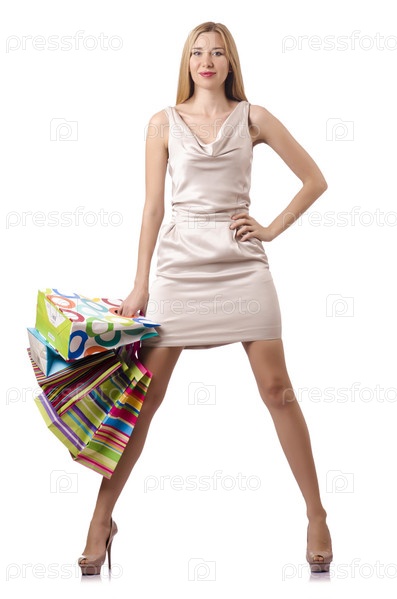 Высокая девушка после удачного шопинга на белом фоне