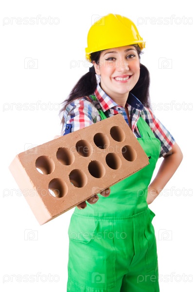 Женщина-строитель с кирпичами на белом фоне